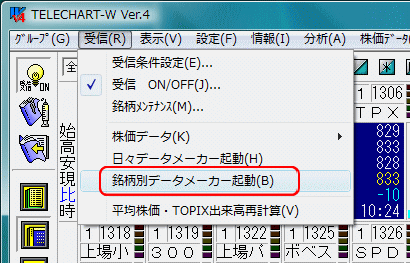 銘柄別データメーカーを起動するには「受信」メニューの「銘柄別データメーカー起動」をクリックしてください。